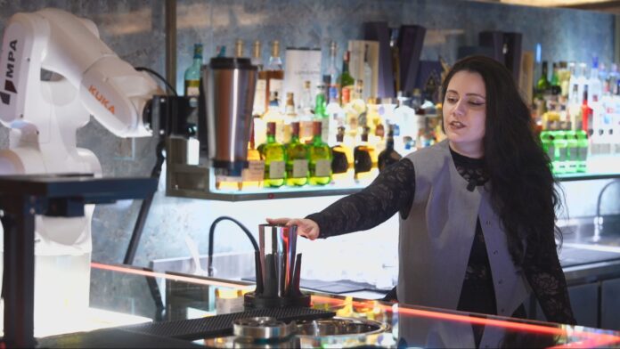 Bartender Jocassia Coelho e o braço robô que prepara drinks.