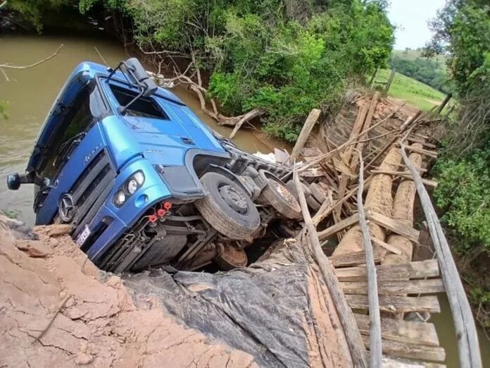 Segundo a Polícia Militar, a estrutura da ponte não resistiu ao peso do caminhão e quebrou, fazendo o veículo despencar. Ninguém ficou ferido.