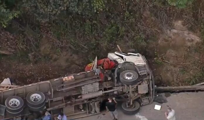 Um caminhão que transportava uma carga de tijolos tombou na altura do km 94 da BR-040, pista de descida da Serra, no sentindo Rio de Janeiro. O acidente ocorreu por volta das 6h30 desta segunda-feira (3).