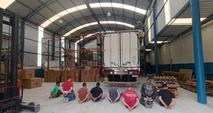 Ao todo, oito suspeitos foram presos, sendo três no carro e cinco no galpão. A polícia também apreendeu dez celulares.