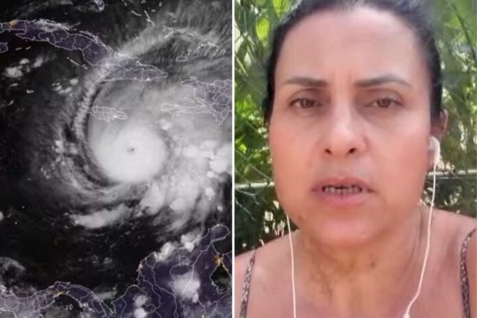 Juliana Modesto segue na Jamaica com o marido. À esquerda uma imagem de satélite do furacão Melissa sobre o mar do Caribe em 26 de outubro de 2025