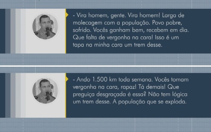 Ainda no áudio, o coronel fala sobre a necessidade de policiamento para população pobre e ressalta o pagamento dos policiais. “Larga de molecagem com a população, povo pobre, sofrido. Vocês ganham bem, recebem e, dia. Que falta de vergonha na cara! Isso é um tapa na minha cara um trem desse!”, afirma.