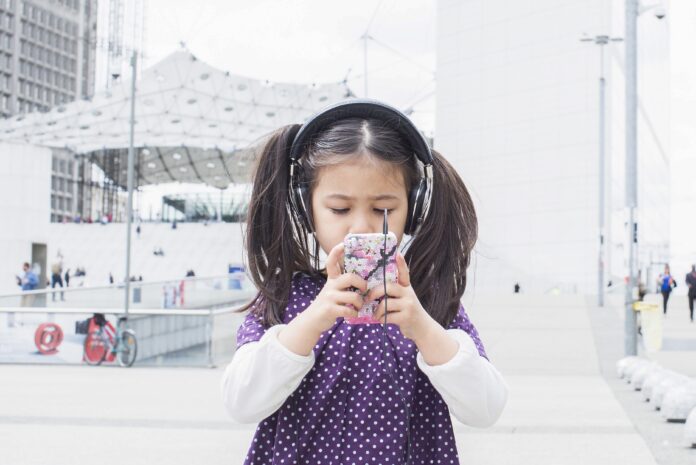 Criança mexe em um smartphone enquanto ouve música com fones de ouvido
