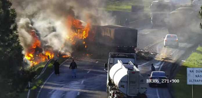 A colisão provocou um incêndio e bloqueou o trânsito no km 272 da rodovia. Conforme informações preliminares, um dos veículos carregava soja e o outro transportava frutas.