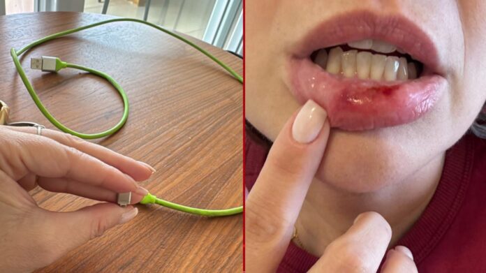 Em um impulso, ela tentou recolocá-lo no cabo – que não era o original do celular.