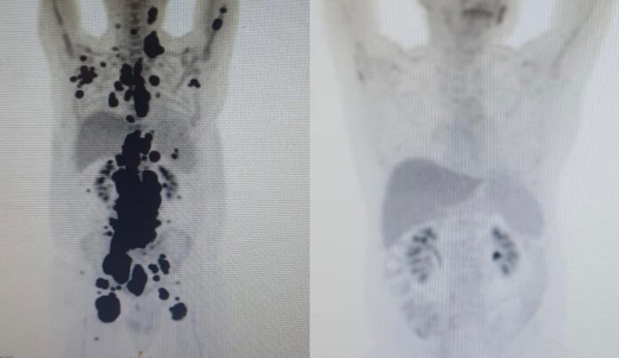 As duas imagens do Pet Scan (tomografia feita com um contraste especial) (veja no alto) representam “dois Paulos”: a da esquerda, o paciente que tinha como caminho único os cuidados paliativos, quando a alternativa é dar conforto, mas já sem expectativa de cura, e a da direita, um paciente com um organismo já sem tumores após o tratamento com CAR-T Cell.