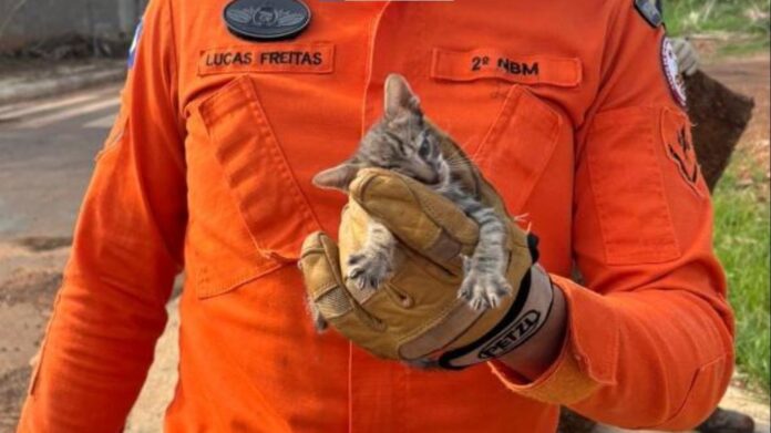 Um filhote de gato foi resgatado por uma equipe do Corpo de Bombeiros após ficar preso em bueiro em Confresa, a 1.160 km de Cuiabá, nessa terça-feira (28). A equipe foi chamada, após moradores ouvirem miados vindos da estrutura do bueiro.