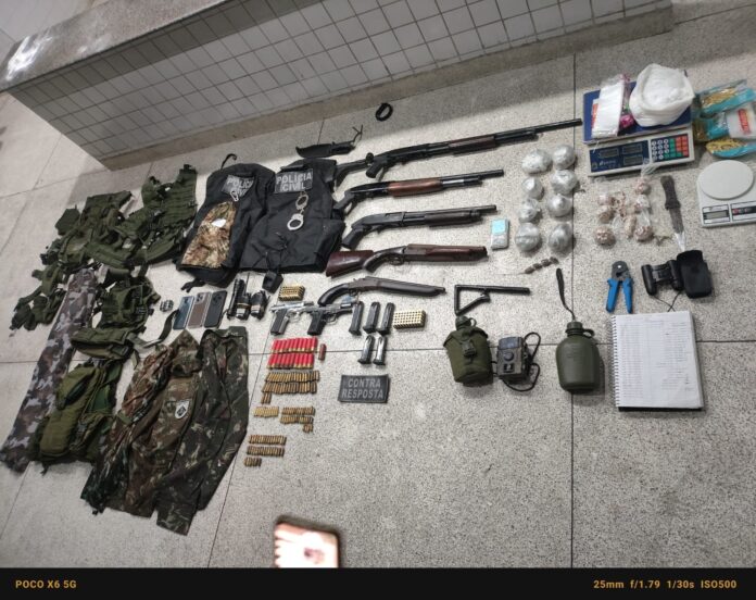 O material apreendido inclui pistolas, espingardas, rádios comunicadores, celulares, munições de vários calibres, além de 1,5 kg de cocaína, 487 pedras de crack e 400 porções de maconha. O homem e os objetos foram encaminhados à Delegacia de Camaragibe.