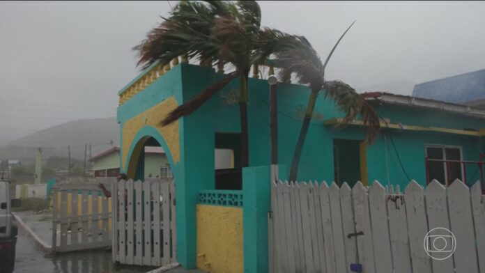 Mal dava para enxergar a praia. Mas era possível ver os danos nos prédios. Toda essa força é porque as águas do Caribe estão muito mais quentes do que o normal. Com isso, o furacão absorve mais vapor d’água e calor na trajetória, ganhando mais força.