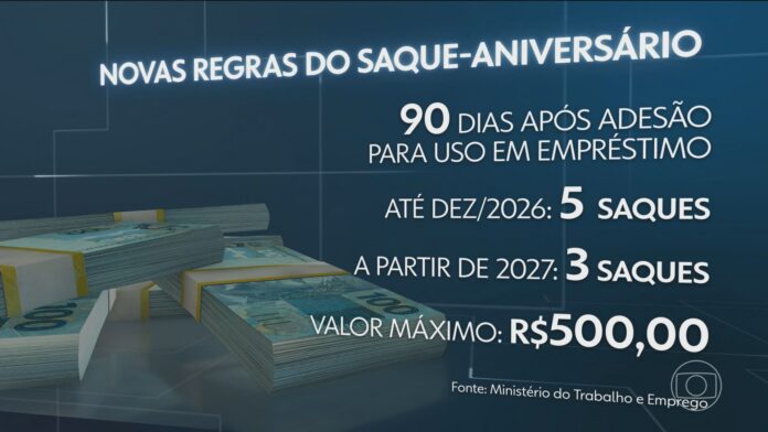 A partir de agora, passam a valer novas regras para antecipação do saque-aniversário do FGTS. O Conselho Curador do Fundo estabeleceu limites para a quantidade de operações a serem realizadas em um ano, prazos e valores que poderão ser antecipados. Quem aderir ao saque-aniversário deverá aguardar 90 dias para usá-lo em empréstimos no banco.