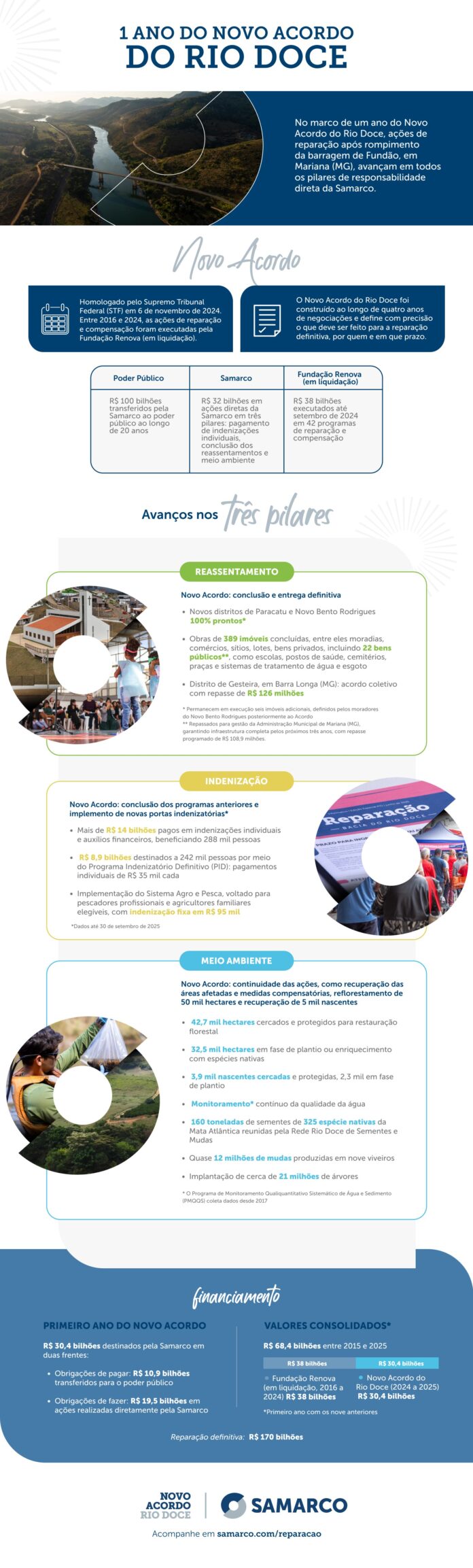 O processo de reparação pelo rompimento da barragem de Fundão, em Mariana (MG), foi redefinido desde a assinatura do Novo Acordo do Rio Doce, em novembro de 2024. No período de um ano, há avanços em todas as ações de responsabilidade direta da Samarco, incluindo a conclusão das obras iniciadas antes da assinatura nos distritos de Novo Bento Rodrigues e Paracatu.