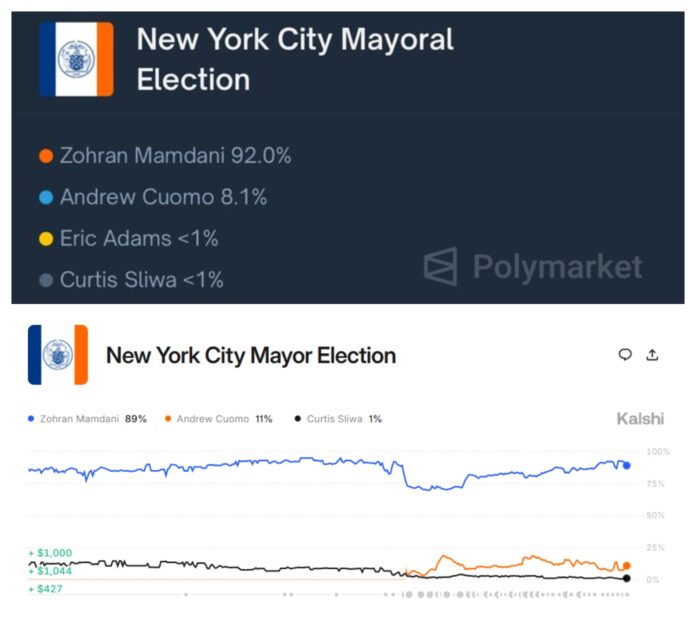 A casa Polymarket apontava que: 92% dos apostadores acreditavam que Mamdani deve ser eleito, enquanto 8,1% acreditavam que será Cuomo