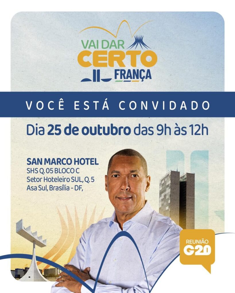 O secretário nacional do Podemos, Luiz França, realiza neste sábado (25) mais uma edição do G20 – Grupo dos Amigos do França –, encontro que se consolida como um dos principais espaços de articulação política do Distrito Federal. O evento acontecerá das 9h às 12h, no Hotel San Marco, no Setor Hoteleiro Sul.