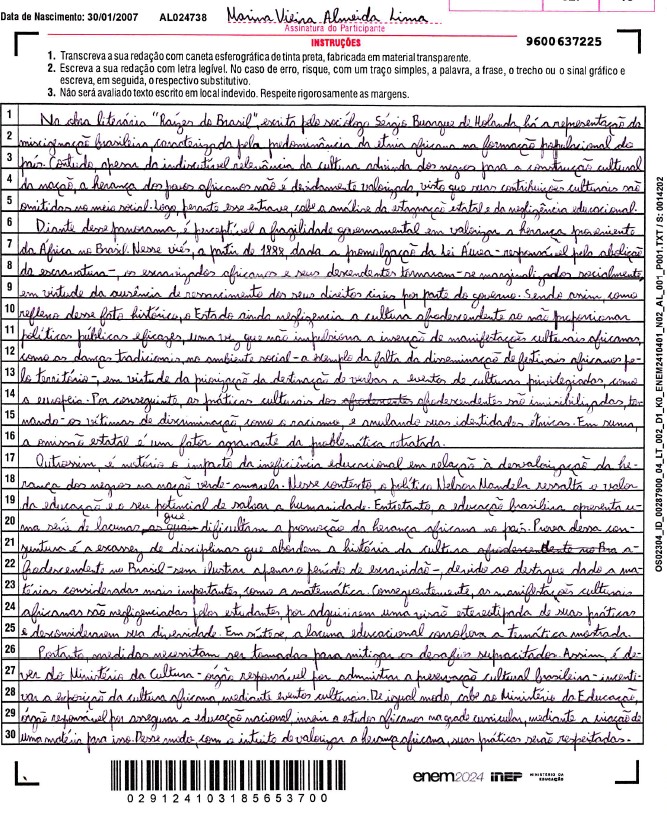 Redação nota mil de Marina Vieira Almeida Lima, no Enem 2024.