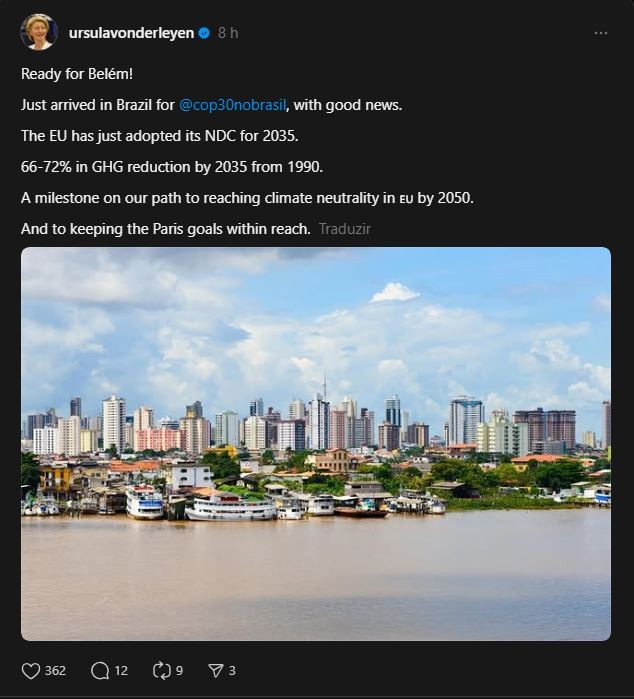 “Just arrived in Brazil for @cop30nobrasil, with good news. The EU has just adopted its NDC for 2035. 66-72% in GHG reduction by 2035 from 1990. A milestone on our path to reaching climate neutrality in 🇪🇺 by 2050. And to keeping the Paris goals within reach”, informou.