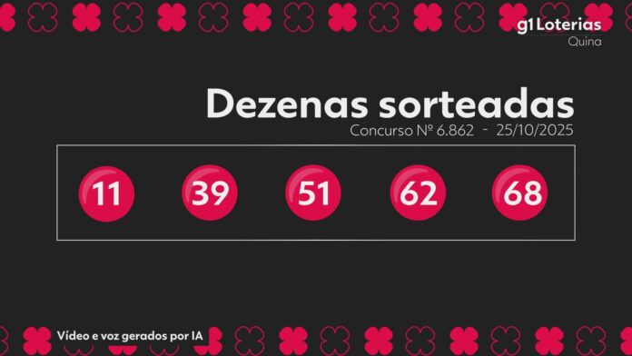 Veja abaixo os números do sorteio do concurso 6862 da Quina realizado neste sábado (25):