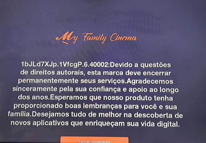 O My Family Cinema informou que “devido a questões de direitos autorais, esta marca deve encerrar permanentemente seus serviços”.