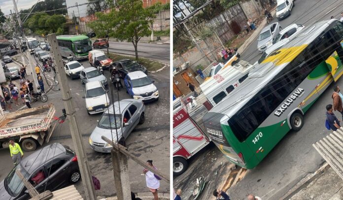 Imagens de câmeras de monitoramento registraram o momento em que o caminhão desce a rua e atinge a lateral do ônibus fretado, que trafegava pela via. Após a colisão, o veículo segue em movimento, e acerta os carros — assista ao vídeo acima.