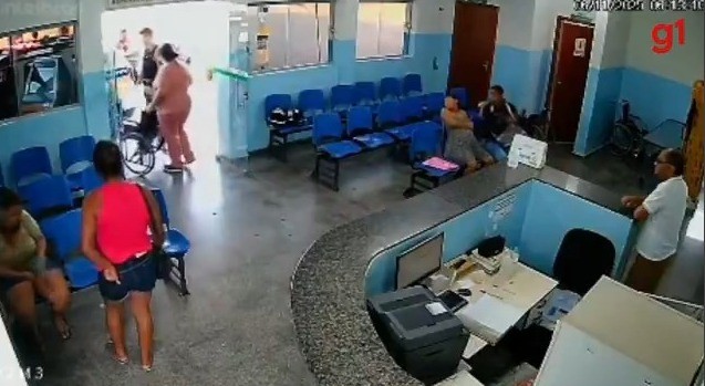 O vídeo divulgado pela corporação mostra o momento em que os policiais chegam a uma unidade de saúde com a mãe em uma cadeira de rodas, enquanto outra pessoa carrega a recém-nascida.