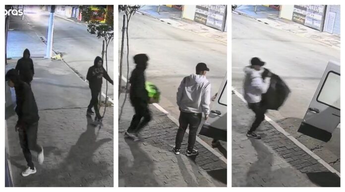 Câmeras de segurança do local registraram o momento que os criminosos chegaram no local, às 4h27 da manhã.