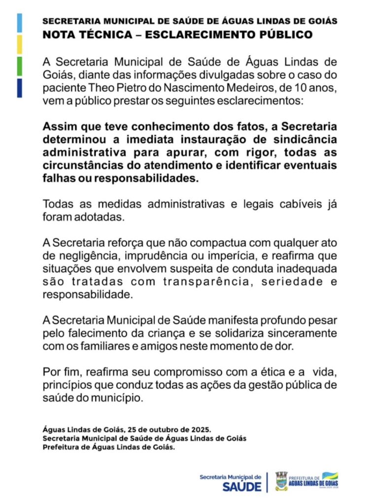 A Secretaria Municipal de Saúde de Águas Lindas de Goiás informou, em nota oficial, que instaurou uma sindicância interna para apurar as circunstâncias do atendimento prestado ao menino Theo Pietro do Nascimento Medeiros, de 10 anos, na UPA do Mansões Odisséia.